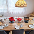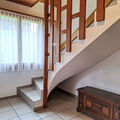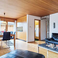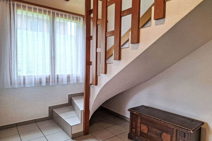 "WOKA 1", 5-room semi-detached house on 2 levels. Spacious and bright, practical and cosy furnishings: open living/dining room with dining nook, radio and electric heater. Exit to the balcony. 1 room with 1 bed (90 cm, length 200 cm). Kitchen (3 hot plates, oven, dishwasher, toaster, kettle, electric coffee machine, Capsules for coffee machine (Delizio) extra, raclette grill, fondue Set (cheese)) with hatch. Sep. WC. Electric heating. Upper floor: 1 double bedroom with 1 double bed (180 cm, length 200 cm). Exit to the balcony. 1 children's room with 1 x 2 bunk beds (90 cm, length 200 cm). 1 room with 2 beds (90 cm, length 200 cm). Bath/shower/WC, double hand-basin. Electric heating. Large balcony, south facing position and west facing position. Marvellous panoramic view of the mountains and the valley. Facilities: children's high chair, baby cot (extra), hair dryer, baby changing unit. Internet (WiFi, free). Garage (2 cars), height 190 cm. Please note: suitable for families. Non-smokers only. Smoke alarm, fire extinguisher.