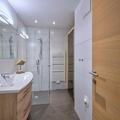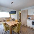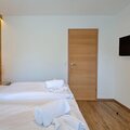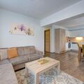 Inside, the apartment is bright, modern, and spacious, with two comfortable bedrooms ideal for families or friends. The open-plan living area flows seamlessly into a fully equipped kitchen, complete with a dining table and colorful chairs, creating a warm space to relax, cook, and share stories after an adventurous day. The bathroom features a private infrared sauna, providing a peaceful escape while the balcony offers serene views over the surrounding alpine landscape.