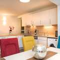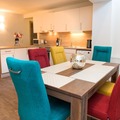 Inside, modern interiors meet cozy alpine charm. The spacious living area, bright with natural light, features a comfortable lounge, a TV, and a dining table surrounded by colorful chairs—perfect for family meals or après-ski gatherings. The kitchen is fully equipped for everything from quick breakfasts to gourmet dinners. Three inviting bedrooms ensure restful nights, and the bathroom’s private infrared sauna offers the ultimate post-ski relaxation. Step onto the balcony and let the crisp mountain air and sweeping views awaken your senses.