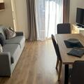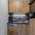 Inside, the apartment feels bright and welcoming, with warm wood tones and a relaxing atmosphere. The living and dining area features a comfortable double sofa bed (140 x 200 cm), a satellite TV, and a dining table — the perfect spot to unwind after a day in the mountains. The modern kitchenette is fully equipped with a 2-ring ceramic hob, oven, dishwasher, fridge with freezer, toaster, electric kettle, and a filter coffee machine, making every meal easy and enjoyable.