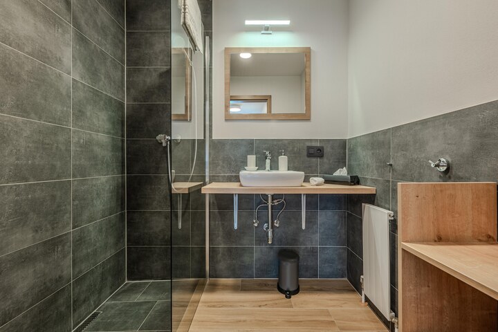 The cozy bedroom offers a restful double bed, while the bathroom includes a shower, washbasin, and hairdryer. A separate toilet adds convenience. Step onto the balcony to enjoy fresh alpine air and peaceful views of the surrounding peaks.