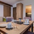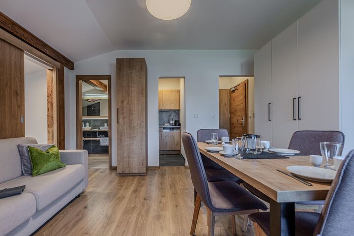 Inside, the apartment feels bright and welcoming, styled with light wood and soft tones that reflect the charm of Tyrolean living. The cozy living and dining area features a comfortable double sofa bed, a satellite TV for relaxed evenings, and a dining table perfect for gathering after a day in the mountains. The fully equipped kitchen — with a ceramic hob, oven, dishwasher, fridge-freezer, toaster, kettle, and coffee maker — makes cooking feel easy and enjoyable.