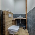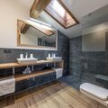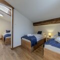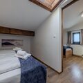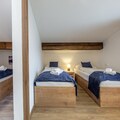 Two peaceful bedrooms provide restful spaces: one with a double bed and another, accessed through an interconnecting room, with two single beds, ideal for families or small groups. The modern bathroom features a shower, dual washbasins, a toilet, and a hairdryer, while a second separate toilet adds extra convenience. Step out onto the balcony to take in fresh mountain air and watch the slopes come alive below.