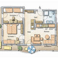 "Nannerl und Wally", 4-room apartment 96 m2 on 1st floor. Very comfortable and tasteful furnishings: living/sleeping room with 1 double bed, dining table, kitchen corner and satellite TV (flat screen). 1 double bedroom with satellite TV (flat screen). 1 room with 1 bed, 1 double bed and satellite TV (flat screen). Kitchen-/living room (oven, dishwasher, 4 ceramic glass hob hotplates, toaster, kettle, microwave, electric coffee machine). 2 showers/WC. Balcony. Marvellous distant view of the mountains and the valley.
