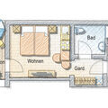 "Freches Nannerl", 1-room apartment 24 m2 on 1st floor. Object suitable for 2 adults. Very comfortable and tasteful furnishings: living/sleeping room with 1 double bed, dining table, kitchen corner and satellite TV (flat screen). (dishwasher, 2 ceramic glass hob hotplates, toaster, kettle, microwave) with dining table. Shower/WC. Balcony. Balcony furniture. Marvellous panoramic view of the mountains and the valley. Facilities: Internet (WiFi, free).