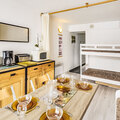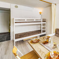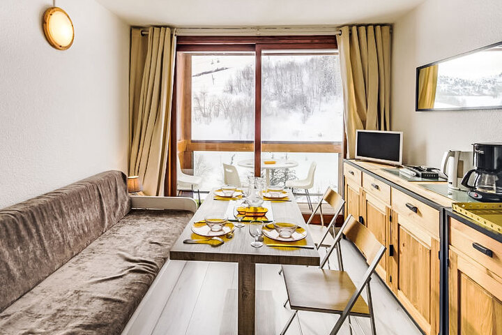 1-room studio 22 m2 on 8th floor. Beautiful furnishings: living/sleeping room with 1 x 2 bunk beds (90 cm, length 190 cm), 1 pull-out bed (2 pers. 2 x 80 cm, length 190 cm), TV (flat screen). Exit to the balcony, south facing position. Kitchenette in the entrance (oven, 2 ceramic glass hob hotplates, toaster, kettle, microwave, electric coffee machine, raclette grill, fondue Set (cheese)). Bath/WC. Electric heating. Parquet floors. Balcony 4 m2, south facing position. Balcony furniture. View of the ski run. Facilities: hair dryer. Internet (WiFi, extra). Please note: maximum 1 pet/ dog allowed. Smoke alarm. Offer by a private individual according to Art. 155, IV of CGI.