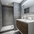Bathroom 1: Shower, Towel dryer, and Single hand basin