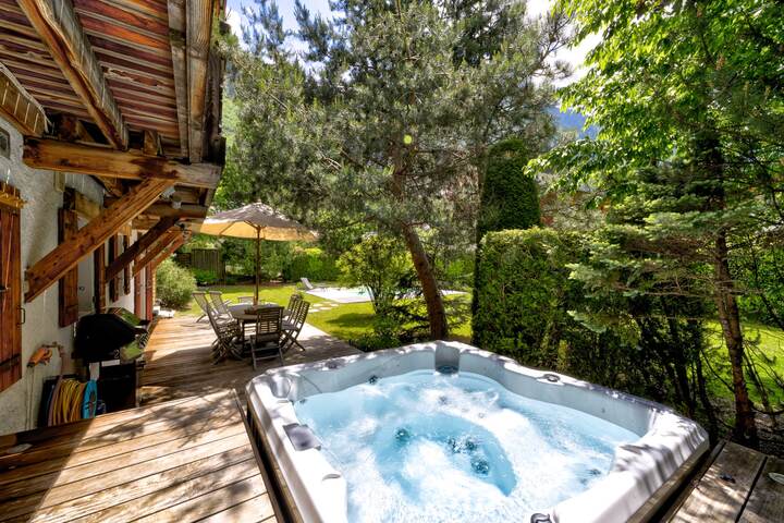 The chalet in Chamonix-Mont-Blanc has 6 bedrooms and capacity for 12 persons. Accommodation of 220 m² homely and is spacious, It has mountain and garden. The property is located 0 m metro station, 220 m bus station "Mer de Glace bus stop", 350 m city "Chamonix Centre", 350 m train station "Chamonix-Mont-Blanc", 350 m the restaurant "Moo", 450 m river "Arve", 500 m ski resort "Planards Nursery Slopes", 550 m the restaurant "Mumma", 550 m the restaurant "Joia", 650 m supermarket "Super U", 700 m ski resort "Savoy Nursery Slopes", 800 m supermarket "Carrefour", 1 km bus station "Chamonix-Sud Bus Station", 2 km ski resort "Le Brevent", 2 km hospital "Hospital Mont-Blanc", 2 km ski resort "La Flegere", 3 km golf course "Chamonix les Praz 18 hole golf course", 8 km ski resort "Grands Montets", 10 km ski resort "Les Houches", 12 km ski resort "Le Tour & Vallorcine", 99 km airport "Geneva Airport", 99 km international airport "Geneva Airport" and it is located in a a residential zone and in a mountainous area. The accommodation is equipped with the following items: garden, outdoor furniture, washing machine, dryer, barbecue, fireplace, iron, internet (Wi-Fi), hair dryer, balcony, hot tub, central heating, heated swimming pool private, covered parking in the same building, 2 TVs, satellite tv (Languages: English, French), DVD. The open plan kitchen, of gas, is equipped with refrigerator, microwave, oven, freezer, dishwasher, dishes/cutlery, kitchen utensils, coffee machine, toaster, kettle and stove.