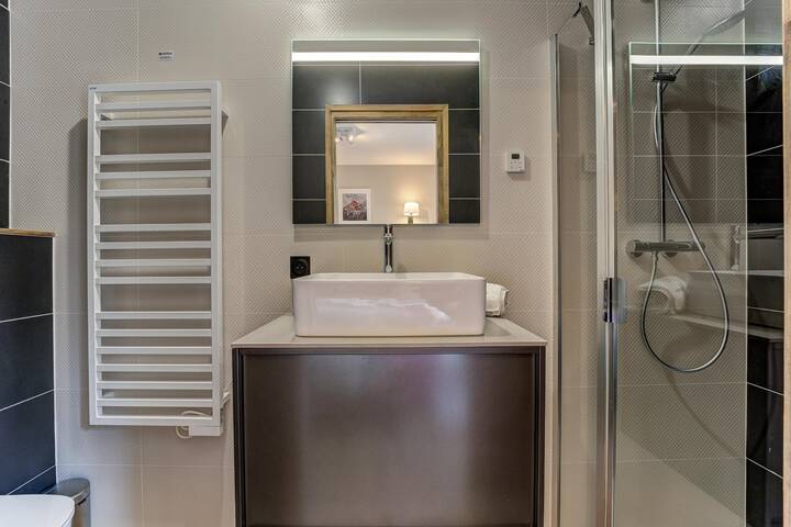 The apartment in Chamonix-Mont-Blanc has 2 bedrooms and capacity for 4 persons. Accommodation of 83 m² tastefully-furnished and is a new build, It has mountain. The property is located 1 m ski resort "Le Brevent", 2 m ski resort "Savoy Nurseray Slopes", 2 m ski resort "Planards Nursery Slopes", 4 m ski resort "La Flegere", 9 m ski resort "Les Houches", 10 m ski resort "Grands Montets", 13 m ski resort "Le Tour & Vallorcine", 230 m hospital "Hospital Mont-Blanc", 300 m the restaurant "Little Boxes", 300 m bus station "Chamonix Sud Bus Station", 450 m river "Arve", 550 m supermarket "Spa", 600 m the restaurant "Bighorn Bistro", 600 m the restaurant "Dainty Pizza", 700 m supermarket "Casino", 750 m city "Chamonix Centre", 850 m train station "Aiguille du Midi", 950 m supermarket "Carrefour", 1 km train station "Chamonix-Mont-Blanc", 5 km golf course "Chamonix les Praz 18 hole golf course", 99 km airport "Geneva Airport", 99 km international airport "Geneva Airport" and it is located in a a well connected zone and in a mountainous area. The accommodation is equipped with the following items: elevator, outdoor furniture, terrace, washing machine, iron, internet (Wi-Fi), hair dryer, central heating, covered parking in the same building, 1 fan, 1 TV. The open plan kitchen, of induction, is equipped with refrigerator, microwave, oven, freezer, dishwasher, dishes/cutlery, kitchen utensils, coffee machine, toaster, kettle and stove.