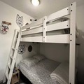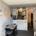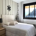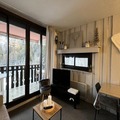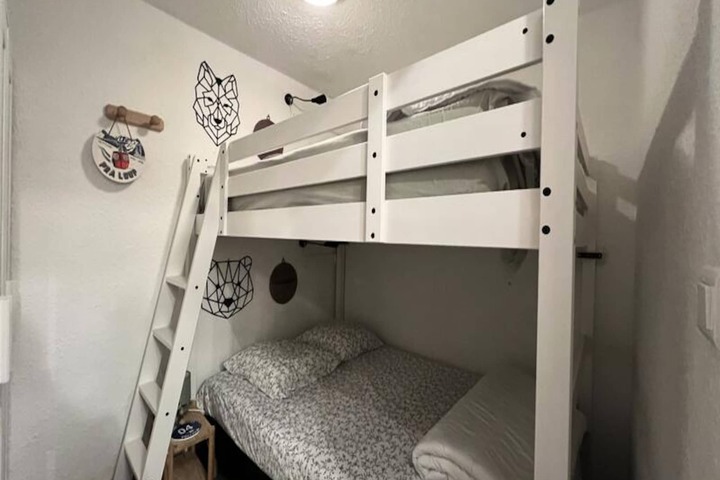Spanning 60 square meters, this thoughtfully designed apartment comfortably accommodates up to eight guests. The living room, with its cozy double sofa bed, HD TV, and dining area, opens onto the balcony, creating a bright and welcoming space to relax. The semi-open kitchen is fully equipped with modern appliances, including a Nespresso machine, dishwasher, and even a raclette grill for those quintessential French mountain meals. The sleeping arrangements are versatile and family-friendly, featuring a spacious master bedroom, a second bedroom with a mezzanine, and a cozy cabin with bunk beds. Additional amenities such as a washing machine, heated towel rail, and individual ski locker ensure your stay is as convenient as it is comfortable.