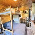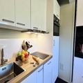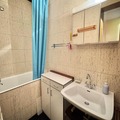 The apartment features a built-in fold-down double bed, a sofa bed with a bunk bed above, and a bathroom equipped with a bathroom. The studio includes a small bathtub (note the high rim) and a separate toilet.