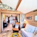 Bright living room with a sofa bed (sleeps 2), 2 armchairs, and a television.