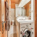 - 1 Bathroom with a shower, vanity unit, heated towel rail, toilet, and washing machine