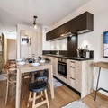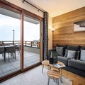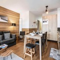 This thoughtfully designed 2-room apartment with a cozy sleeping alcove accommodates up to six guests, ensuring a comfortable and memorable experience. The open-plan kitchen is fully equipped for preparing hearty meals after a day of adventure, while the living room, complete with a plush sofa bed, opens onto a private terrace where you can unwind and soak in the stunning vistas. The main bedroom features a luxurious double bed, complemented by a charming bunk bed room, making it perfect for families with children. Modern amenities such as a ski locker, enclosed garage, and included services like linens, toiletries, and end-of-stay cleaning add to the convenience and ease of your stay.