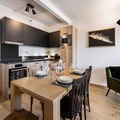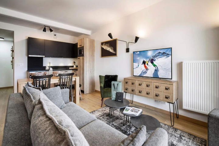 Thoughtfully designed to blend modern comfort with alpine authenticity, this apartment accommodates up to six guests. The open-plan kitchen is fully equipped for preparing hearty meals after a day on the slopes, while the cozy living room with a sofa bed opens onto a spacious terrace, inviting you to soak in the panoramic vistas. The master bedroom features a plush double bed and an en-suite shower room, while the sleeping alcove with bunk beds provides a snug space for children or friends. Additional amenities include a bathroom with a bathtub, a separate toilet, and a convenient ski locker for your gear. Two outdoor parking spaces are also at your disposal.