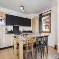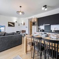 Designed with both style and comfort in mind, the apartment accommodates up to 8 guests, making it ideal for families or groups of friends. The thoughtfully arranged layout includes a cozy living room with a sofa bed, a fully equipped open-plan kitchen, and two spacious bedrooms—one with a double bed and another with twin beds. An additional sleeping alcove with bunk beds ensures everyone has their own space. Modern amenities such as a ski locker, enclosed garage, and luxurious bathrooms (one with a bathtub) enhance the convenience and relaxation of your stay.