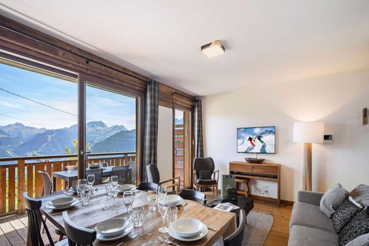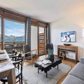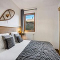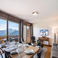This spacious two-bedroom apartment with a sleeping alcove comfortably accommodates up to eight guests. The layout is thoughtfully designed to balance privacy and shared spaces, making it ideal for families or groups of friends. The open-plan kitchen is fully equipped for preparing hearty meals after a day of exploring, while the cozy living room with a sofa bed opens onto a balcony where you can soak in the stunning mountain views. Bedrooms include a master suite with a double bed and en-suite shower room, a twin room, and a bunk bed room, complemented by a separate shower room and additional toilet. Practical amenities like a ski locker and enclosed garage add to the convenience.