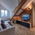 Step inside to discover a thoughtfully designed space that comfortably accommodates up to 10 guests. The ground floor features a cozy living room with a television, a fully equipped kitchen that opens onto a dining area with a warm fireplace, and three inviting bedrooms, including a charming bunk room perfect for children or larger groups. Two bathrooms, one with a bathtub and one with a shower, ensure convenience for all. Upstairs, an additional double bedroom provides a private sanctuary. The balcony offers a peaceful spot to soak in the crisp mountain air and stunning surroundings.