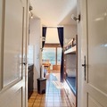 The apartment comprises a sleeping alcove with a bunk bed and a sofa bed in the living room. There is a shower room and a separate WC. You can relax on the southeast-facing balcony while admiring the view. Amenities include a washing machine, internet access, and a television. The fully equipped kitchen includes a refrigerator, microwave, oven, dishwasher, cooking utensils, coffee maker, and kettle.