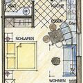 "Studio", 1-room studio 35 m2 on 1st floor. Spacious, rustic and cosy furnishings: entrance hall. Large kitchen-/living room (2 ceramic glass hob hotplates, toaster, kettle, microwave) with 1 double bed, dining nook and satellite TV (flat screen), tiled stove. Exit to the balcony. Shower, sep. WC. Heating. Small balcony, south facing position. Beautiful view of the mountains. Facilities: Internet (WiFi, free). Parking (roofed, 1 car) at the house. Please note: non-smokers only. Maximum 2 pets/ dogs allowed.