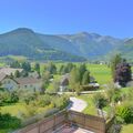 The apartment extends its inviting atmosphere to the great outdoors, offering guests exclusive use of a private balcony. This key highlight of the residence provides stunning, unrestricted panoramic views of the encompassing mountains, complete with cafe-style tables and chairs for alfresco dining, seat cushions, and extra sun chairs to enrich your outdoor relaxation experience. The adjacent garden/grill area, with its furnished picnic table and sun-basking lawn, alongside sun loungers and deck chairs, further enhances the leisure offerings of this unique getaway.