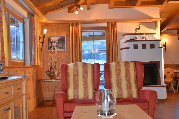 A floor all to yourself! The penthouse flat is very luxuriously furnished with solid wood furniture in a subtle alpine design, which gives this flat an inviting and cosy character. The lift takes you directly to the entrance hall of the flat. From there you enter the spacious living room, which creates a cosy atmosphere with its comfortable seating and fireplace. From the living room you can access the open-plan kitchen, the bathroom and the flat's two bedrooms. The kitchen is fully equipped and has high-quality kitchen appliances. A cosy dining area is the ideal place to enjoy meals. The bathroom is very large and has two washbasins, an exclusive whirlpool and a large rainforest shower. The two bedrooms are very spacious and equipped with large wardrobes and flat-screen TVs. One room also has an extra washbasin. The many large windows and the south-facing terrace offer a fantastic view of the Kitzsteinhorn and the Maiskogel. The flat also has an underground car park and its own cellar compartment with ski boot dryer. If you value luxury, natural, high quality and a cosy atmosphere - you will feel at home here! Facilities 1 bedroom with double bed, TV 1 bedroom with double bed, washbasin, TV 1 large living room, seating area, sofa bed, fireplace, TV, DVD 1 open-plan kitchen with Miele appliances, dining table 1 bathroom with double washbasin, whirlpool, rainforest shower, hairdryer 1 south-facing terrace with table, armchairs, radiant heater 1 separate WC 1 storage room with washing machine, tumble dryer 1 lift directly to the entrance hall of the flat 1 private ski room with ski boot dryer 1 bicycle room 1 underground car park, outdoor parking space free W-LAN Please note The penthouse flat is barrier-free and suitable for allergy sufferers (no pets allowed). Non-smoking flat!
