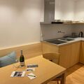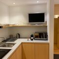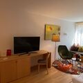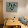 Bathroom with rain shower and toilet, hairdryer, flat screen TV, business equipment (workstation, wireless lan), fully equipped kitchen with coffee machine, tea maker, dishwasher, hob, microwave, cutlery, glasses, crockery, fridge and a charming dining area.