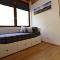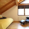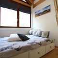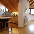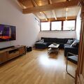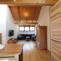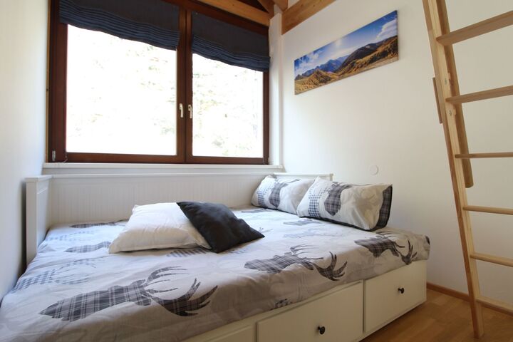 The interior of the flat welcomes you with a practical cloakroom including a ski storage corner and boot warmer. A WC, an inviting double bedroom with balcony and en-suite bathroom with shower are also located on the entrance level. The upper level fascinates with its spaciousness and open-plan concept, which skilfully combines a fully equipped kitchen, a dining table and a relaxation area with sofa and TV. A further bedroom with a double bed, a luxurious bathroom with jacuzzi and shower, a separate toilet and the children's room, which has a single bed that can be converted into a double bed and a delightful play mezzanine, complete the offer.