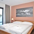 The 99m2 3.5-room penthouse flat offers two bedrooms with comfortable double beds (180x200cm), a bathroom with shower and WC and a bathroom with bathtub and WC. The modern, high-quality and well-equipped kitchen opens onto the spacious living and dining area with a balcony offering a fantastic mountain view.