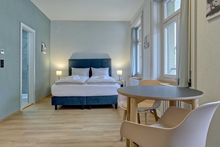 The open and spacious studio combines the sleeping area with the living and dining area in a harmonious and cosy atmosphere. The sleeping area offers a comfortable double bed (160cm x 200cm) that invites you to enjoy restful nights. The adjoining living area is inviting and offers space for a small seating area and a dining table - ideal for relaxing hours. The modern kitchen with cooking facilities, microwave, dishwasher and Nespresso coffee machine is fully equipped and leaves nothing to be desired. The accommodation offers free, shared laundry facilities.