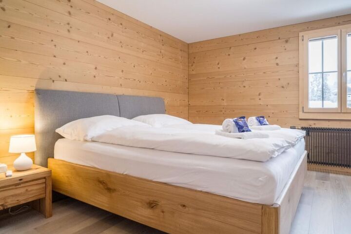 This modern 4.5-room apartment with a lot of charm and cachet is located on the upper floor. Two bedrooms with double beds, one bedroom with bunk beds, a bathroom with shower and toilet and a separate toilet are spread over 118m2 of living space. You can live, cook and eat in the modern, well-equipped kitchen and in the open living/dining area. You can enjoy relaxing moments on the balcony with views of the mountains.
