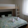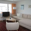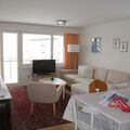 Inside, you will find comfortable furnishings that are perfectly designed for a relaxing stay. The flat has a spacious living room with a large sofa bed, an armchair, cable TV, radio and a dining table for 8 people. All floors are covered with either elegant wood or practical tiles, making the flat allergy-friendly. For your comfort, there are two bathrooms: one with bathtub, WC and washing machine tower including tumble dryer, the other with shower, WC and shower partition.