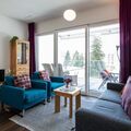 The flat is comfortably and practically furnished. The bedroom leads to the bathroom with bathtub, WC and washbasin as well as to the glazed and furnished balcony. The shower with WC and washbasin is located by the entrance. The living room with open-plan kitchen and sofa bed also leads to the balcony with a magnificent view of the Davos mountain scenery.