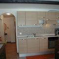 Living room with kitchenette and dining area, French windows to the terrace (Radio, flat TV, HD DVD, free WiFi Internet). Appliances and accessories: Fridge, Oven, Dishwasher, Coffee machine, and main kitchen accessories.