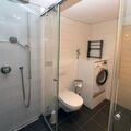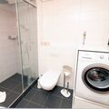The bathroom is spacious and has a modern shower, washbasin, washing machine and WC.
