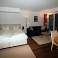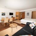In the living room/bedroom there is a dining table with 4 chairs, a pull-out sofa, a double bed and a TV. A garage parking space belongs to the room.