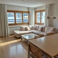Living/dining room: spacious living/dining room with light-coloured sofa, TV, radio and free WLAN. Dining table for 6 people, view of Lake St. Moritz and the mountain panorama