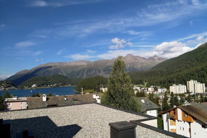 Balcony and private roof terrace with views over Lake St. Moritz and the entire valley.