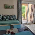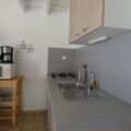 It features a living room with open kitchenette, two bedrooms, a bathroom and a terrace. The living room has a dining table with chairs and a sofa bed for one person (size 1.20m x 1.90m). The kitchen includes a fridge, freezer, gas cooker, coffee machine and kettle. The two bedrooms have a double bed (1.60m x 1.90m) and two separate single beds (0.80m x 1.90m/0.70m x 1.90m). The bathroom has a shower, toilet and sink. There is electric heating in the bathroom and living room.