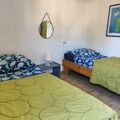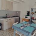 It features a living room with open kitchenette, two bedrooms, a bathroom and a terrace. The living room has a dining table with chairs and a sofa bed for one person (size 1.20m x 1.90m). The kitchen includes a fridge, freezer, gas cooker, coffee machine and kettle. The two bedrooms have a double bed (1.60m x 1.90m) and two separate single beds (0.80m x 1.90m/0.70m x 1.90m). The bathroom has a shower, toilet and sink. There is electric heating in the bathroom and living room.