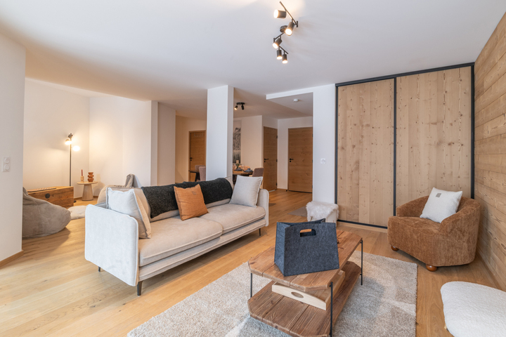 Located on the ground floor, the EXPRESSION A02 apartment offers three refined bedrooms, two bathrooms and generous spaces bathed in light. A cosy décor and a chic mountain atmosphere characterise this exceptional property, designed for high-end comfort.