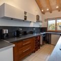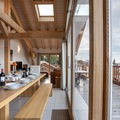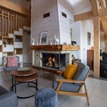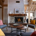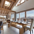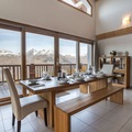 At the heart of the chalet is an open-plan living, dining and kitchen area, flooded with natural light and framed by uninterrupted views of the surrounding peaks. The spacious layout includes two inviting lounge areas—one centred around a stunning stone fireplace for cosy evenings, the other ideal for stretching out, playing games, or enjoying quiet time after a day on the slopes.