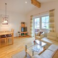 Living room(TV, DVD player, stereo unit), open kitchen(dining table, stove, electric kettle, toaster, coffee machine(filter), oven, microwave, dishwasher, fridge-freezer), bedroom(double bed), bedroom(double bed), bathroom(bath tub, toilet), bathroom(shower, private infrared cabin, toilet, washing machine), recreation room(shared with other guests)(infrared sauna(shared with other guests), sauna(shared with other guests), billiards(shared with other guests)), balcony, heating(central), garden furniture, parking, parasol, high chair, Charging post for electric cars, baby crib(free)