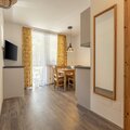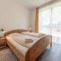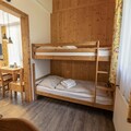 The 35 m² vacation apartment can accommodate up to 4 people. The apartment is furnished in a rustic alpine style and has two bedrooms with a double bed and bunk beds. The living/dining area features a cozy sitting area with a flat-screen TV and an adjoining terrace. The bathroom is equipped with a bathtub and toilet. The well-equipped kitchenette has all the necessary utensils.