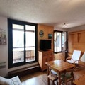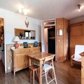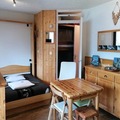 This cozy studio apartment for 4 to 5 people offers a comfortable stay with a south-east facing balcony and panoramic mountain views. The living room features a convertible sofa, a foldaway bed, and an HD TV, ensuring ample space for relaxation. The studio also includes a mountain corner with two bunk beds and storage for your belongings. This non-smoking apartment is pet-free and provides a pleasant environment with parquet flooring, double glazing, and wooden shutters to maintain a peaceful atmosphere.