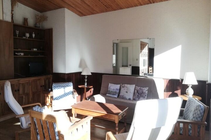 This spacious 3-room apartment is perfect for up to 8 guests, offering a comfortable and functional stay. The living room features a sofa bed, flat-screen TV, armchairs, and a large dining table, all with access to a large south/south-west facing terrace with breathtaking views of the slopes and valley. The apartment also includes two bedrooms, one with a double bed and the other with two sets of bunk beds. The property is non-smoking and does not allow pets.