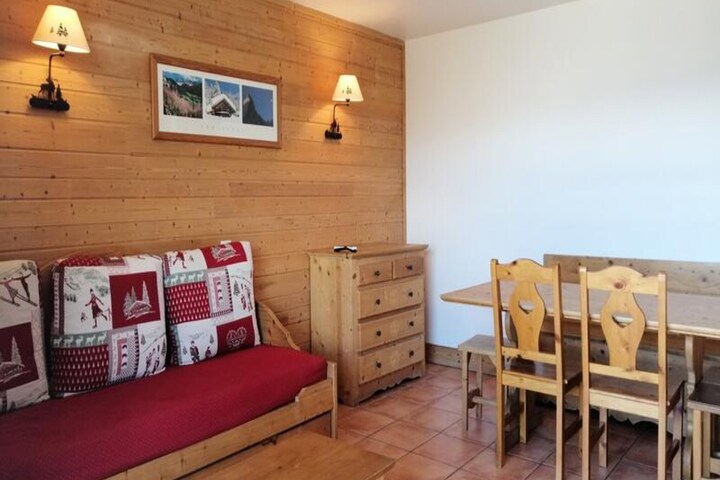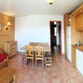 This cozy 3-room apartment, ideally suited for 7-8 people, is located on the ground floor and offers an east-facing orientation with a balcony that provides a stunning view of the mountains. The apartment features a welcoming entrance area with a set of bunk beds, while the spacious living room includes a pull-out sofa bed, a television, a dining area, and balcony access for relaxation with scenic views. The two bedrooms are furnished with double beds and ample storage for your belongings, ensuring comfort during your stay. Please note, the apartment is non-smoking, and pets are strictly prohibited.