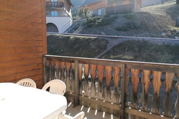 This cozy studio, located on the first floor, is perfect for 2 to 4 people. It features a living room with a pull-out sofa bed and a double folding bed, providing flexibility and comfort. The studio is equipped with wooden furniture, a flat-screen TV, and a balcony that offers a peaceful view. Please note that pets are not allowed, and the apartment is non-smoking.