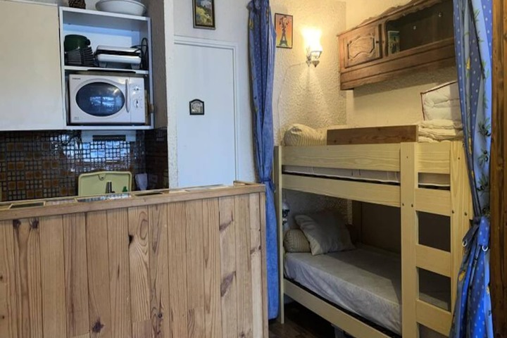 Inside, the studio is thoughtfully designed to accommodate up to four people. The entrance features a bunk bed, while the spacious living room boasts a comfortable sofa bed, dining area, and direct access to the balcony. The kitchenette is equipped with modern amenities, including a Senseo coffee machine, raclette grill, and microwave, making it easy to prepare hearty meals after a day of outdoor activities. The bathroom includes a bathtub and washing machine for added comfort during your stay. A ski locker on the ground floor ensures hassle-free storage of your equipment, while parking at the residence adds further convenience.