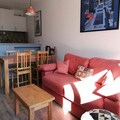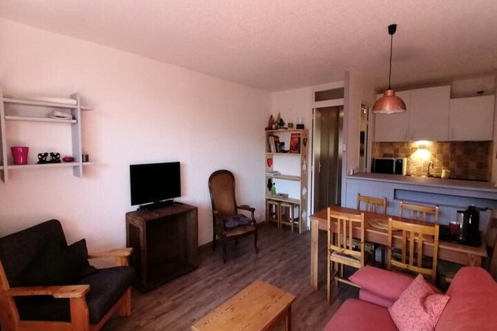 This spacious and well-maintained 2-room apartment is perfect for a family or group of up to 6 people. Located on the 1st floor, it features a cozy living room with a double sofa bed (140x190), HD TV, and a dining area, all leading to a large balcony with stunning views of the valley and mountains. The bedroom is equipped with a double bed (160x200), a set of bunk beds, and ample storage space. The apartment is non-smoking and includes electric shutters for added convenience. Please note, pets are not allowed. The property is also equipped with a ski box and ski room for guests.